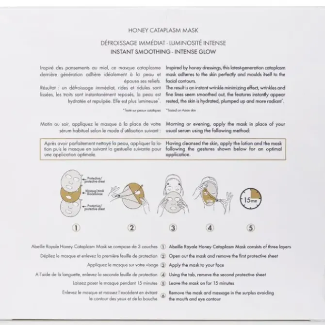 - A cataplasm mask inspired by honey dressings that adheres to the skin and molds itself to the facial contours. Formulated with pure honey from the Black Bees of the Island of Ouessant, which is rich in amino acids, trace elements, and fructose content. Blended with Royal Jelly for nourishing benefits. Helps combat signs of aging. Has a fresh and airy honey scent.