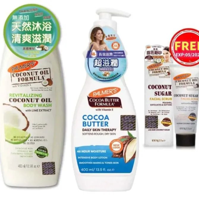 - Palmer's Revitalizing Coconut Oil with Lime Body Wash 400mlIndulge your skin and your senses with every wash. This revitalizing body wash combines natural Coconut Oil and Vitamin E to leave skin hydrated and moisturised. Lime Extract invigorates and refreshes. Palmer's Cocoa Body Lotion 400ml Rich, luxurious Palmer's Cocoa Butter Formula Daily Skin Therapy body lotion provides deep hydration all over. This velvety soft formula absorbs quickly, creating a protective barrier that locks in moisture. From normal to dry to eczema prone skin, this emollient rich lotion effectively heals and softens, leaving skin smooth, supple and beautiful. Palmer's Coconut Sugar Facial Scrub 90g (Exp: 05/2025)Palmer's Raw Coconut Sugar Facial Scrub uses natural exfoliating Coconut Sugar to gently buff & polish away dirt and dead skin cells.Â