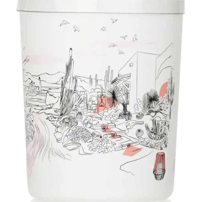 - Presented in a white glass container with sketches representing a living desert with sunny valleys
