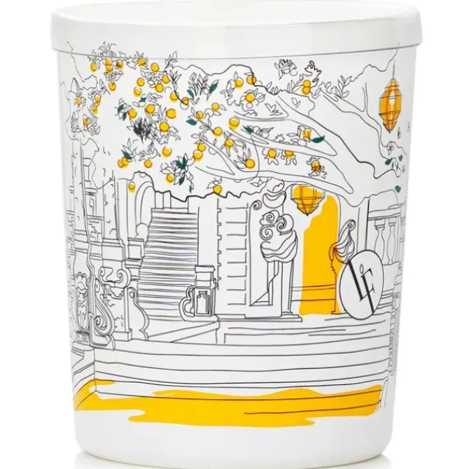 - Housed in a white glass container with drawings that represent the orange trees in all their luminous sparkle