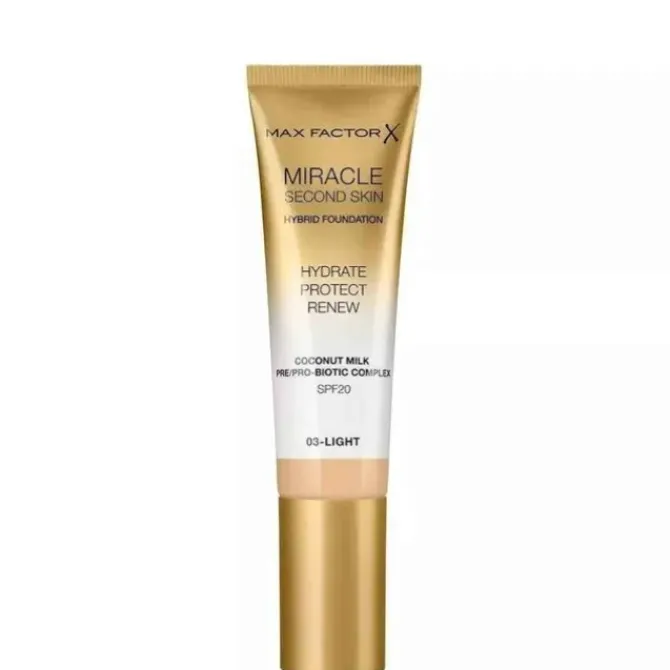 - Max Factor Miracle Second Skin Hybrid Foundation This foundation has the dual effects of skin care and makeup, which can nourish dry skin. The unique formula contains natural coconut extract, combined with prebiotics and probiotics, which helps to enhance the skin's natural defense ability, while moisturizing, reducing skin redness and swelling, and refining pores. Suitable for all skin types, including sensitive skin. The texture is light and moisturizing, and it is very easy to spread. It is like your second layer of skin, which can provide perfect concealer effect while moisturizing, keeping the skin hydrated all day long.