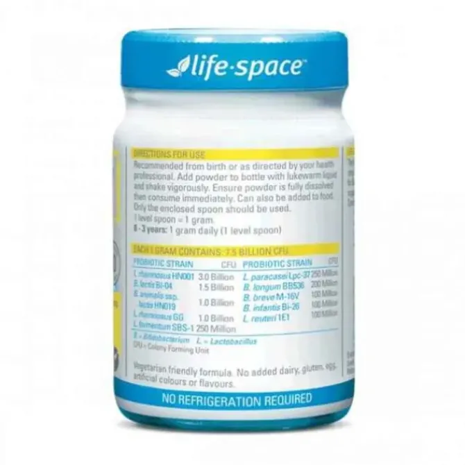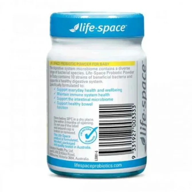 - Scientifically formulated with 10 different strains of premium quality beneficial bacteria, Life-Space probiotics encourage good bacterial diversity to support optimal health and wellbeing for developing infants. Health benefits may include:Supporting the development of a healthy immune systemReducing the risk of developing eczema, as well as the occurrence of eczema, in the first 2 years of life.Assisting with the digestion and absorption of nutrientsHelping to restore beneficial bacteria that may have been disrupted by AntibioticsSupporting normal, healthy bowel movementsNo added dairy, lactose, gluten, yeast, egg, fructose, flavours, colours, artificial sweeteners or preservativesLife-Space is an Australian owned companyLife-Space products are manufactured in AustraliaLive Bacteria GuaranteedWarningsAlways read the label. Use only as directed. If symptoms persist see your healthcare professional."Â