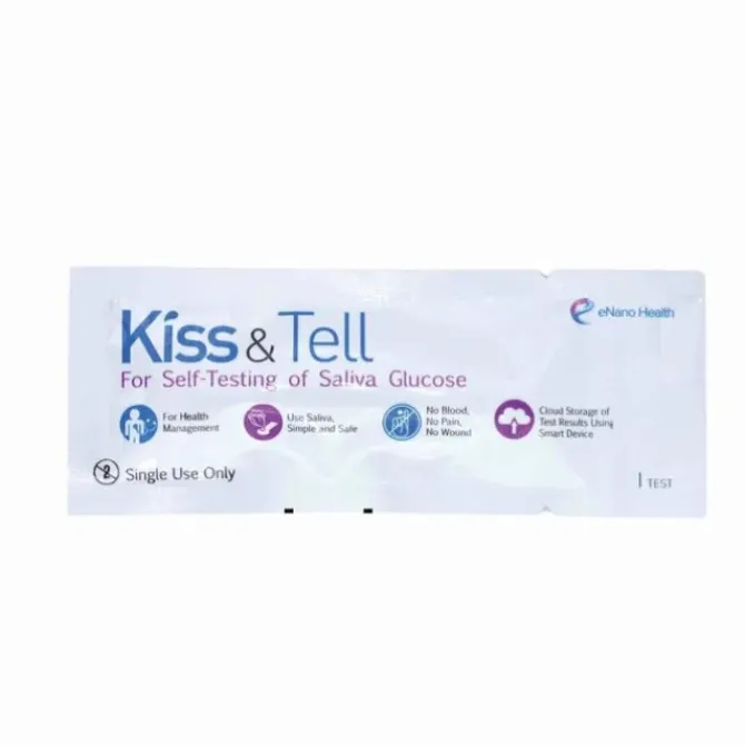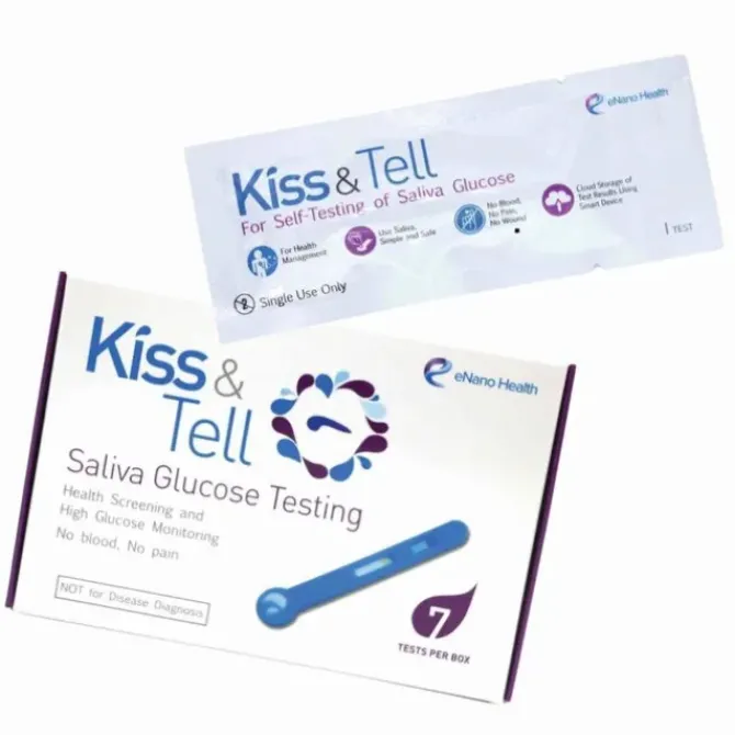 - Kiss & Tell – Saliva Rapid Blood Glucose Test Strips (7 individually packed per box) EH001 The World's First Blood Sugar Test with Saliva Developed in Hong Kong | Made in Hong Kong Monitor your blood sugar levels with saliva and a Kiss and Tell blood glucose teststrips. Provide reliable and non-invasive blood glucose testing methods for diabetic patients. Ideal for general health checks and high blood sugar monitoring, this high-quality blood glucose meter quickly detects blood sugar levels safely and painlessly. It has been scientifically proven that the relationship between saliva and blood sugar in the body will change in response to diet and exercise. Blood sugar levels can be as faithfullyreflected in saliva as blood with high accuracy. Kiss & Tell has completed more thanthousands of sample laboratory tests. Tool for safe, painless glucosemeasurement Allows rapid detection of bloodsugar levels in saliva Ideal for general health checksand high