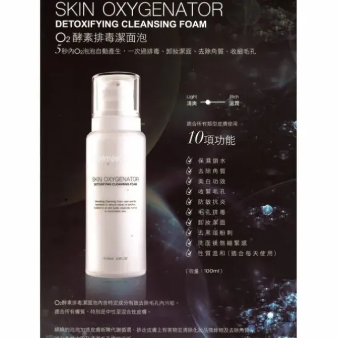 - Skin oxygenator detoxifying cleansing foam formulation, has been especially designedfor a mild but effective cleansing experience, In an inactive stadium this innovative formulation has the appearance of a cleansing mild, when activated with water and massage on the skin the milk turns into a foam.
