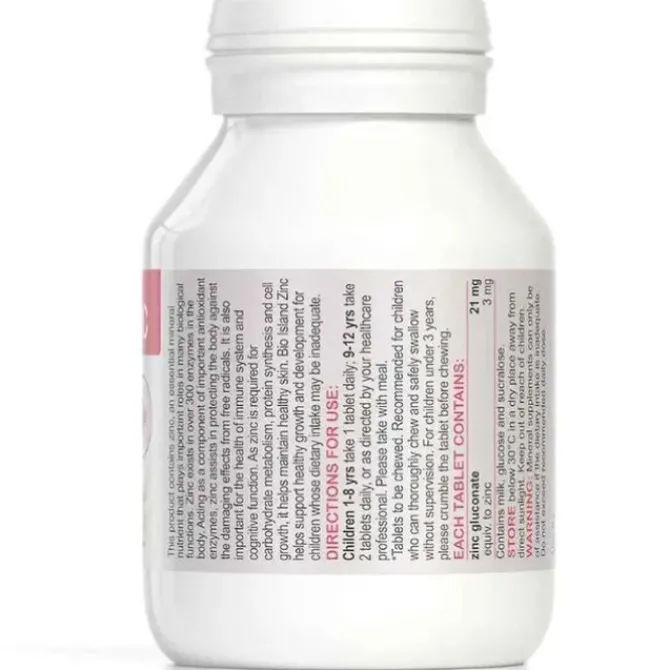 - Bio Island Zinc is suitable for use by children from the age of 1 year, the dosages are based on the Recommended Daily Intakes (RDI) and Adequate Intakes (AI) established by the NHMRC (National Health & Research Council).Supplements zinc which may help maintain healthy immune function and blood sugar balance. This product contains zinc, which is an essential trace mineral that is a component in over 200 enzymes in the body. Zinc is an important nutritional antioxidant, thereby assisting in protecting the body against the damaging effects of free radicals and it support the health and function of the immune system. It may also assist in the maintenance of normal healthy blood sugar balance in healthy children. As zinc is involved in carbohydrate metabolism, protein synthesis and cell growth, it helps to maintain healthy skin, vision and eye function and it is necessary for the proper action of many body hormones.Warnings:Mineral supplements should not replace a b