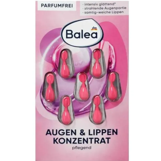 - Balea Eye and Lip Concentrated Essence Capsules are a special and caring care product. Caffeine-containing concentrate provides intense hydration. Plus, the active ingredient Kalpariane replenishes tired skin. Formulated with evening primrose oil, vitamin E and squalane, regular use ensures smooth eye contour and neat brows and lashes. The concentrated serum is also suitable as an intensive treatment for lips, leaving them velvety soft.