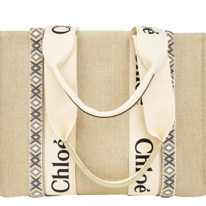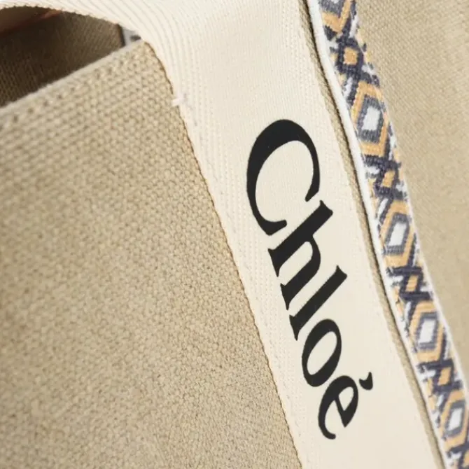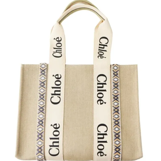 - '- Tote bag in linen & shiny calfskin with handmade embroidery & Woody ribbon