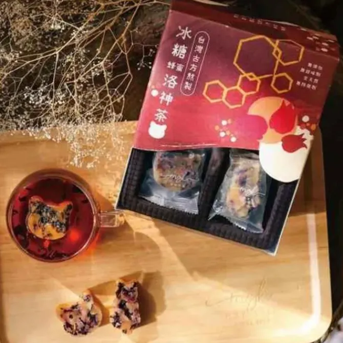- The rock sugar honey Roselle tea brewed by Taiwan's ancient recipe uses Roselle calyx, known as the "ruby of the plant world", rock sugar boiled with top-grade Yulin sugar cane, and natural high-quality honey. It is brewed through 16 steps to create a black cat-shaped tea brick. Natural, without added sweeteners and preservatives, it tastes sweet and sour, with a delicious floral aroma.