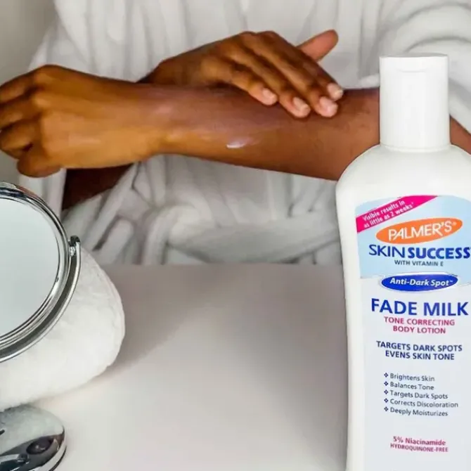 - Dark spots are not limited to the face, blemishes or blotches and uneven skin tone can appear all over the body, especially as a result of sun exposure, acne marks, pregnancy or even severe dryness. Palmer's Skin Success Fade Milk Tone Correcting Body Lotion, 2 weeks* effectively targets melanin spots (such as knees, elbows, chest, etc.), eliminates and fades all kinds of stubborn spots, 98% agree that it is effective for even skin tone**, and deeply moisturizes at the same time , effectively evens and brightens the skin, enhances the radiance of the skin.Â