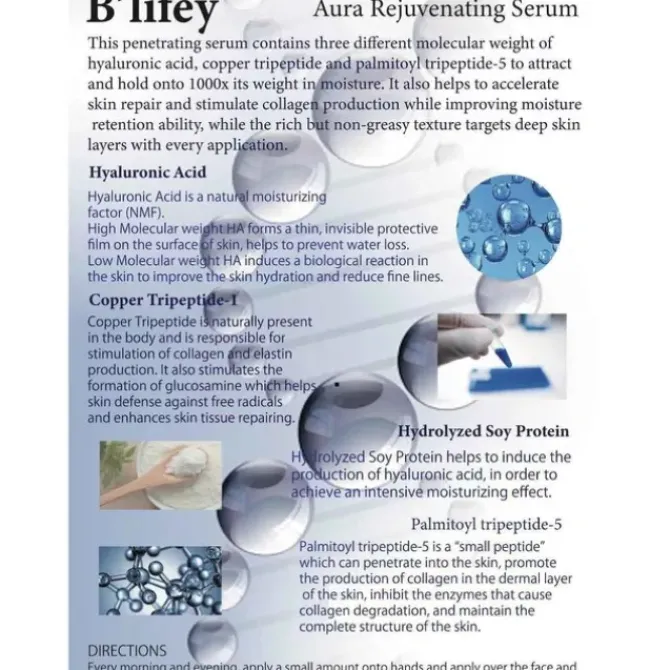 - B'lifey – SwissAura Rejuvenating Serum (Hydrating, Firming, Reduce Fine Lines) (e30ml) BL001 REPAIRS SKIN TIGHTENS SKIN REDUCE FINELINES SOOTHESDRYNESS IMPROVESHYDRATION This penetrating serum contains three differentmolecular weight of hyaluronic acid, copper tripeptide and palmitoyltripeptide-5 to attract and hold onto 1000x its weight in moisture. It alsohelps to accelerate skin repair and stimulate collagen production whileimproving moisture retention ability, while the rich but non-greasy texturetargets deep skin layers with every application.