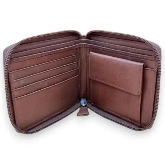 - Approximate size: 4. 4" x 3.75" x 0.7"This Zip Coin Wallet is made of full grain US cowhide leather and remains it be the heart and soul of . Hand assembled by skilled craftsmen to our specifications in order to give you the style, function, and overall quality you have come to expect. The zipper zips around the wallet to hold everything securely inside. The zipper pull has an extended leather piece making it easy to pull. There are four card slots on the left and a coin pocket on the right that has a snap closure. Bill compartment has a divider to organize your bills form your receipts. Approximate size: 4.4" x 3.75" x 0.7". This wallet is constructed to last, with full grain US cowhide leather and meticulous attention to detail. The zipper pulls easily, and the wallet features four card slots on the left and a coin pocket with a snap closure on the right. A divider in the bill compartment keeps your receipts separate from your cash. And with a compact size of 4.4"
