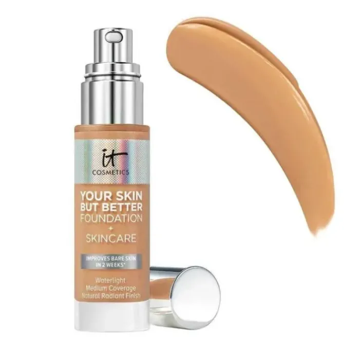 - IT Cosmetics Your Skin But Better Foundation + Skincare effectively improves your skin tone and gives you a more perfect skin. Its smooth and lightweight texture can help improve the appearance of skin, cover blemishes, minimize pores, and provide a natural, flawless finish. After use, skin looks more refined, with improved elasticity and texture.The foundation contains soothing aloe vera, as well as vitamins E and B5, which help nourish the skin and make it comfortable when applied. The hyaluronic acid contained in it can continuously provide moisture to the skin, and the delicate texture gives you a natural and shiny makeup effect, creating a healthy complexion. At the same time, it protects the skin. Whether it's concealing, moisturizing or radiating skin, this foundation has what you need to give you a confident, beautiful glow.